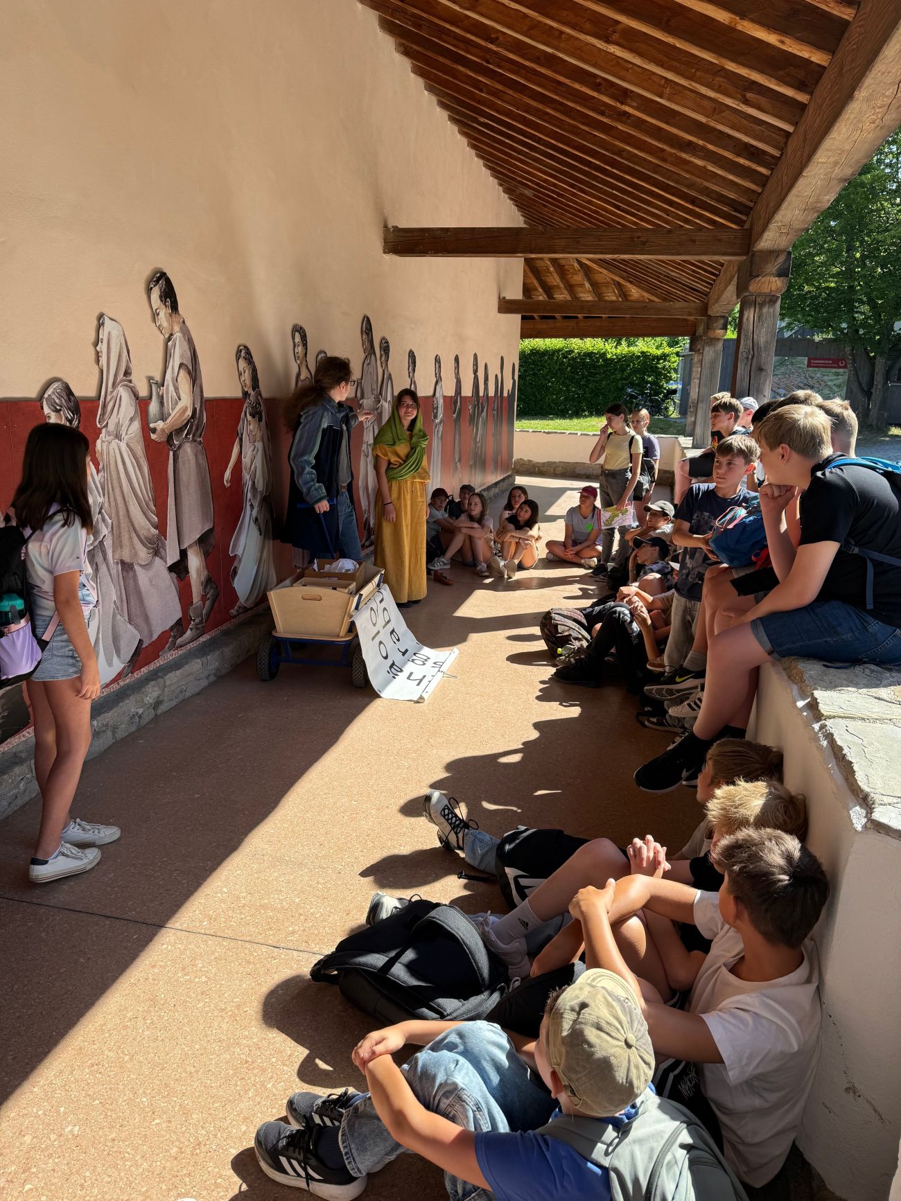 Bei strahlendem Wetter erhielten die Schülerinnen und Schüler eine abwechslungsreiche Führung. Sie tauchten ein in die Welt der alten Römer, konnten originale Fundstellen entdecken und durften sich sogar in römische Gewänder kleiden und damit durch den Tempel schreiten. Nachdem die Hauptgebäude besichtigt waren, ging es im Marschierschritt – dem Passus von 1,48 m, markiert durch Punkte auf dem Boden – wie römische Legionäre in den Außenbereich der Anlage. Dort erfuhren die Klassen Interessantes über die Essgewohnheiten der damaligen Zeit. Anschließend erkundeten sie das weitläufige Gelände mit dem Zentrum der antiken Stadt: den Grundmauern von Forum und Basilika, dem gallorömischen Tempelbezirk sowie den kleinen Thermen.