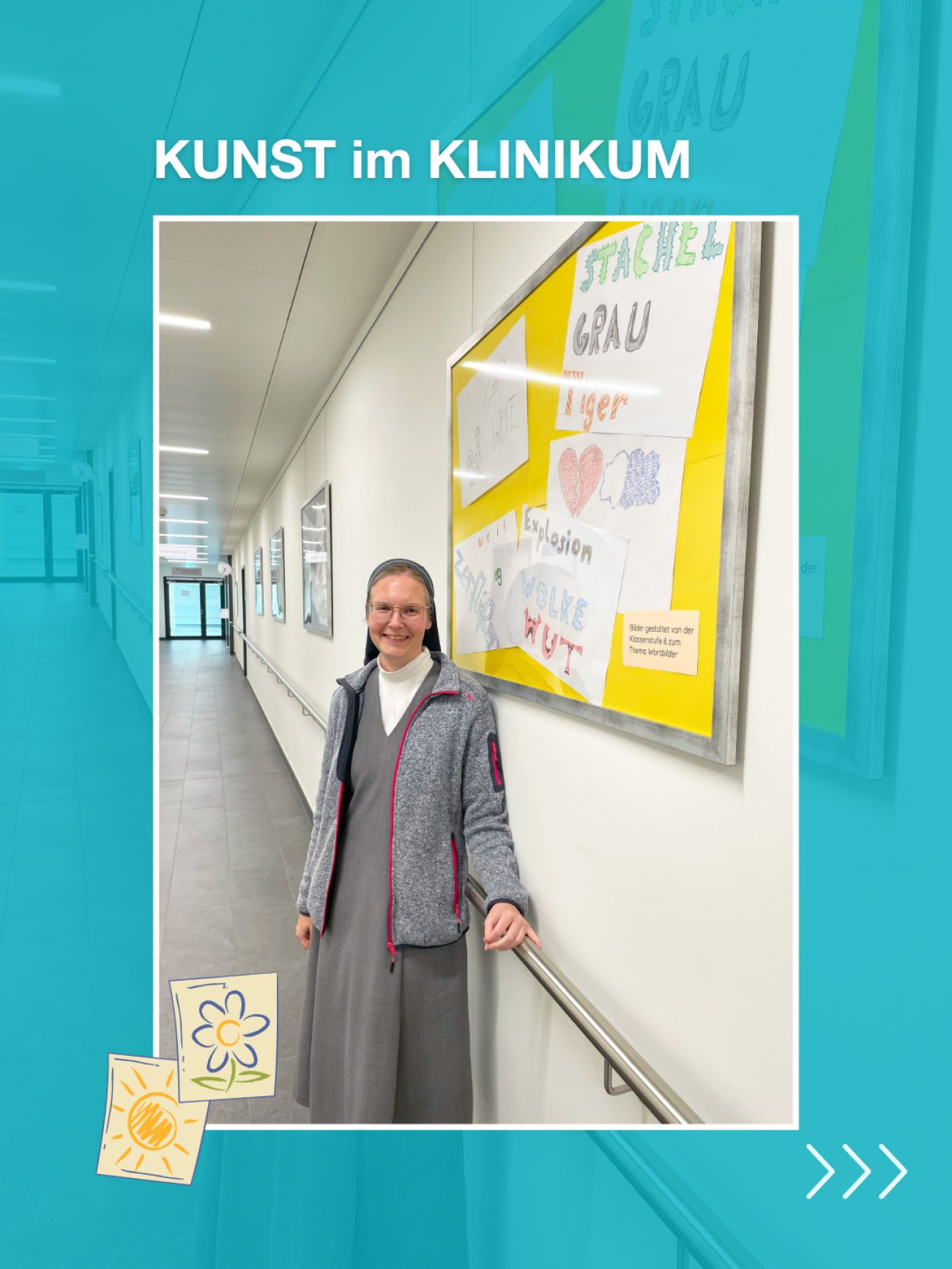 Seit dem 18. Juli 2025 schmücken im Sana Klinikum Biberach Bilder aus dem Kunstunterricht der Klassenstufen 6 und 7 unseres Gymnasiums den Gang zur Kapelle. Die Idee, die Wände, die zur Klinikkapelle führen, ansprechend und lebendig mit Kunstwerken von Schülerinnen und Schülern zu schmücken, wurde von der Klinikseelsorgerin Schwester Dorothea angeregt. Wir danken ihr für die Initiative und für die tatkräftige Unterstützung beim Einrahmen der Bilder. Die aktuellen Bilder aus dem Kunstunterricht sind noch bis Anfang Oktober zu sehen und werden dann von den Kunstarbeiten anderer Schülerinnen und Schüler des Bischof-Sproll-Bildungszentrums ausgetauscht.
