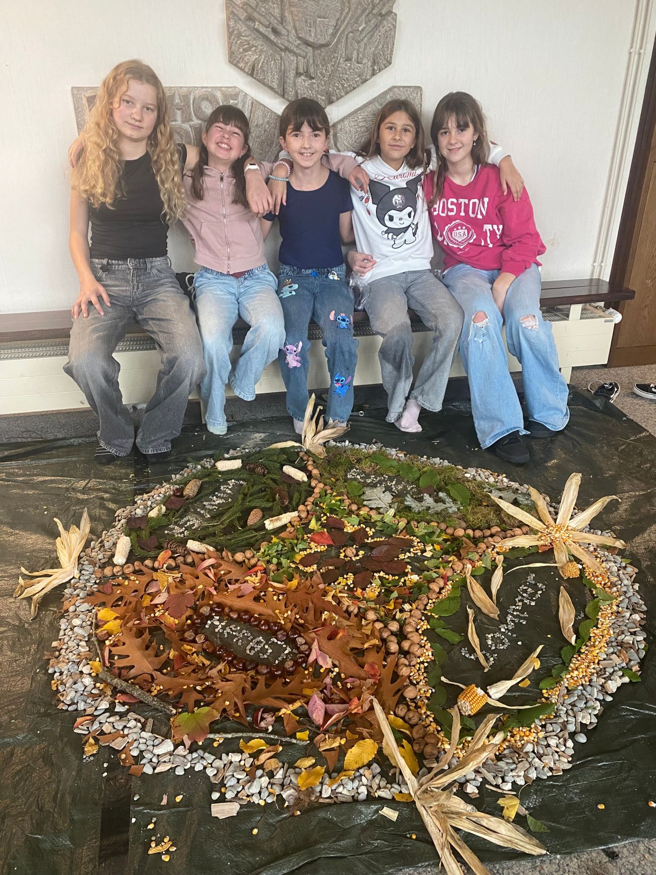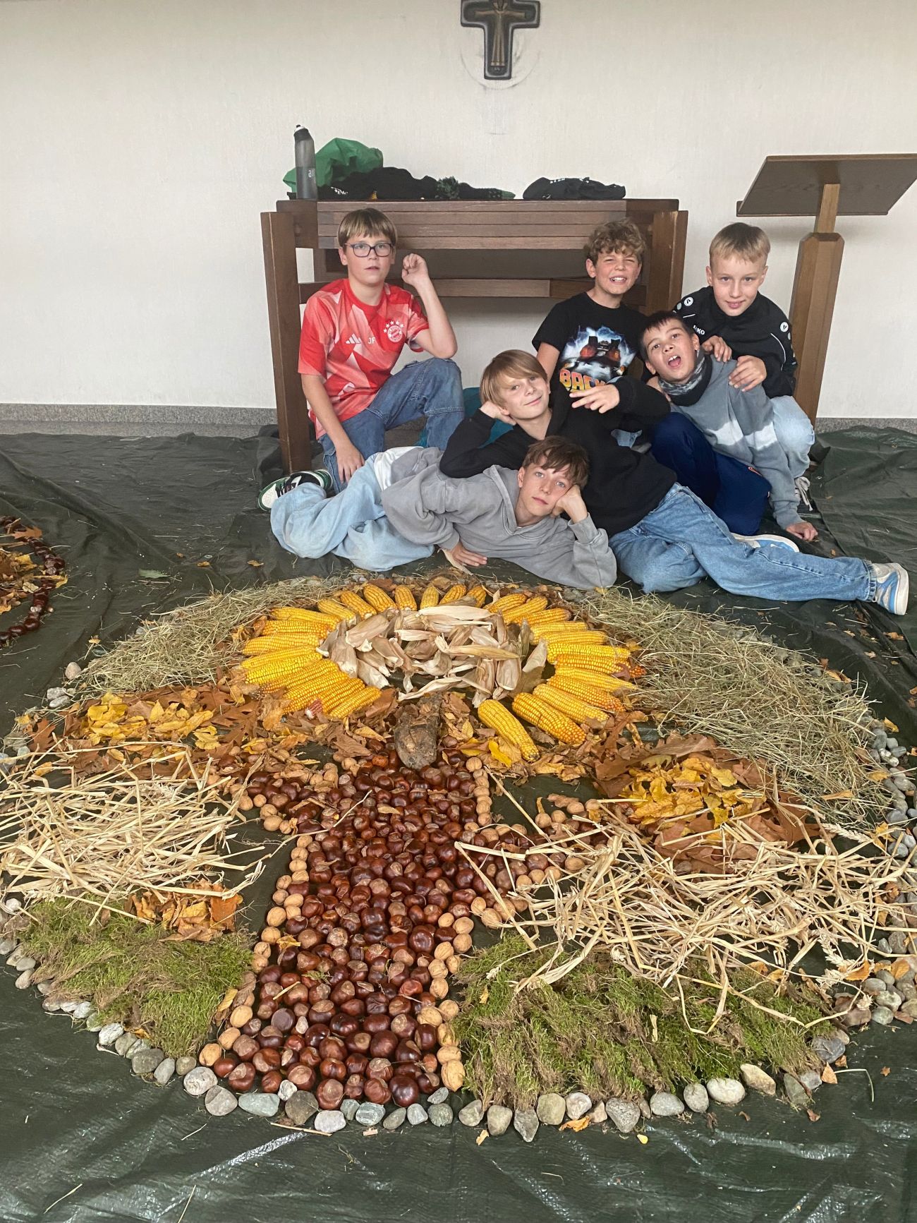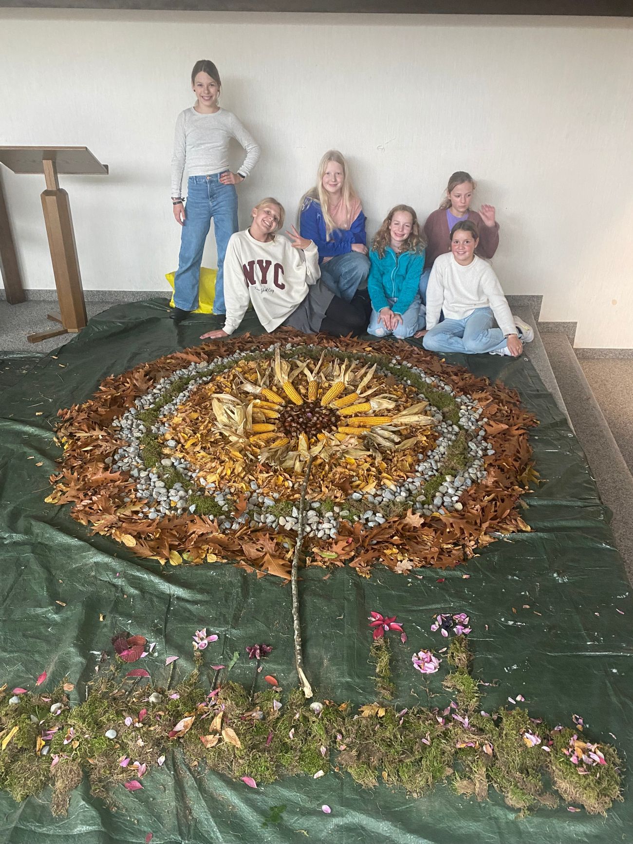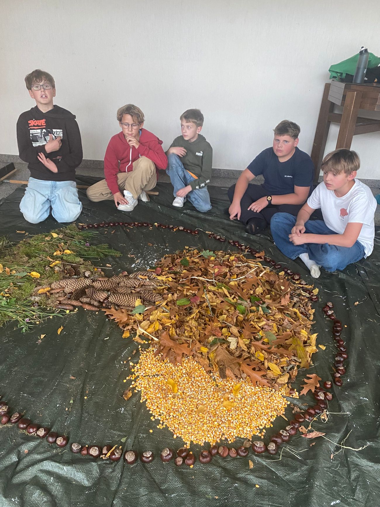 Zwei Tage später wurden mit Wald- bzw. Naturmaterialien Waldmandalas gelegt, die noch ein paar Tage in der alten Aula zu bestaunen sind.