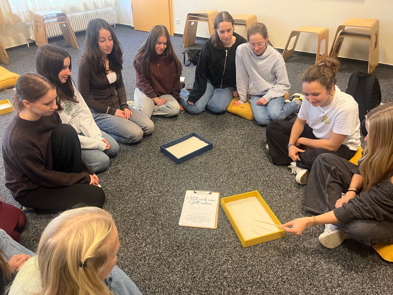 Seit diesem Schuljahr wird an unserer Schule seit langem wieder ein Religions-Leistungskurs angeboten. In einer der letzten Stunden haben wir uns auf eine kreative und schöne Weise mit unserem persönlichen Glaubensweg beschäftigt. Dabei durften wir unseren Lebensweg mit Gott in einer Sandkiste gestalten und mithilfe verschiedener Symbole darstellen. Anschließend erklärten wir einander, welche Erfahrungen, Zweifel, Hoffnungen und Begegnungen wir mit Gott verbinden.