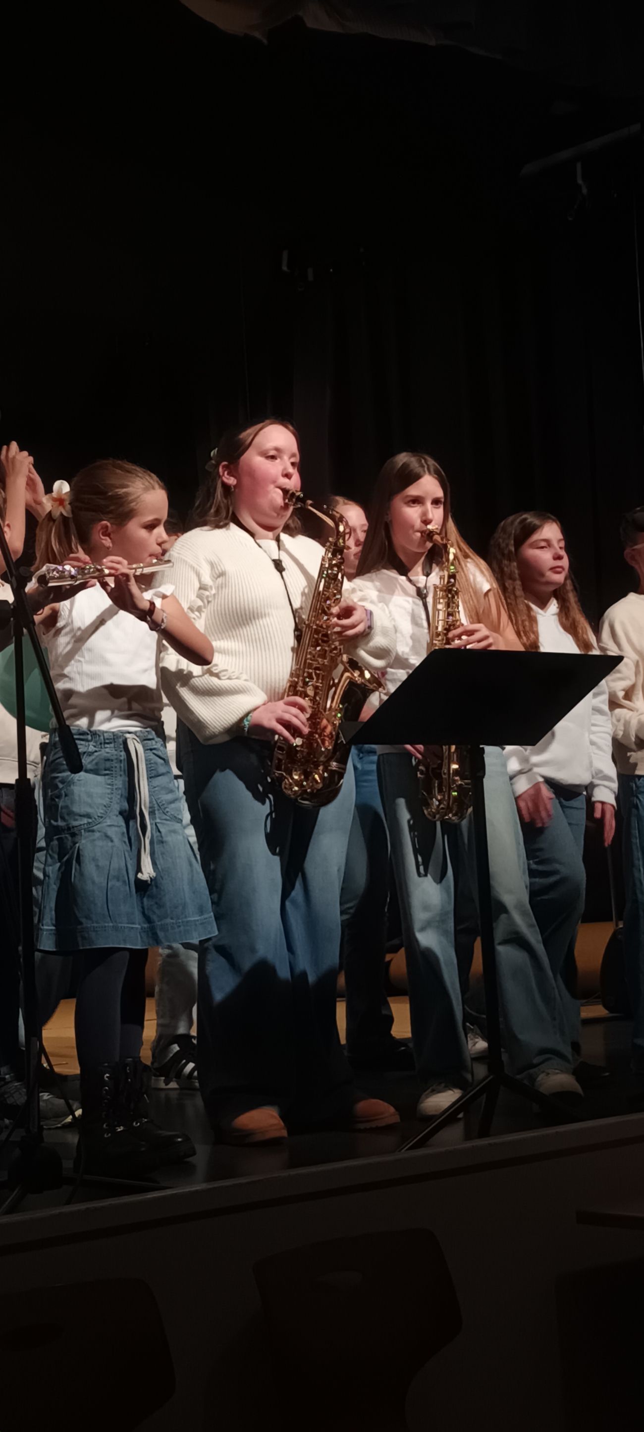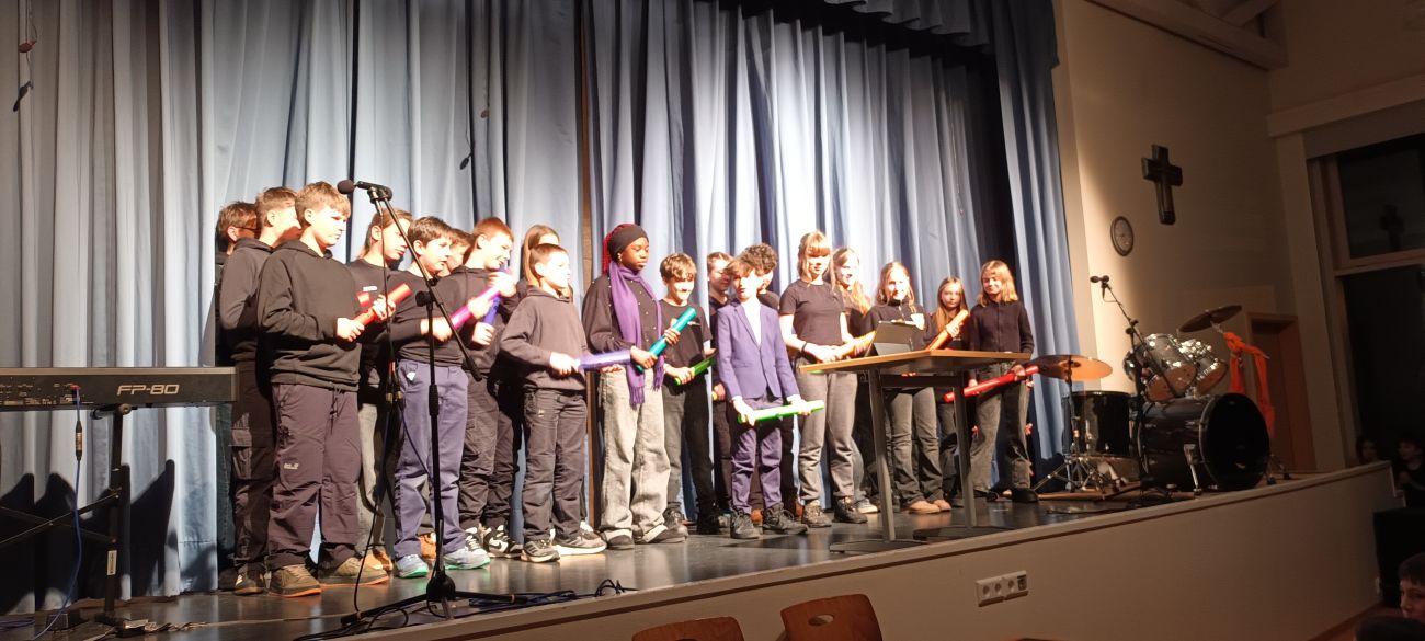 Nach kurzem Umbau entzückten die Mädchen der RS6a durch Tanzakrobatik, bevor ihre Klassenkameraden Tim und Neo das Publikum mit gewagten Reifensprüngen in Atem hielten. Richtig Stimmung im Saal herrschte beim Barbie Song und dem Lied „Wo ist meine Mama, wer hat sie gesehen“. Beide Musikstücke gestalteten die 6. Klassen der WRS mit ihren Boomwhackers gekonnt und mit hoher Konzentration. Mit verblüffenden Effekten verzauberten im Anschluss die 6. Klassen des Gymnasiums das Publikum. Inspiration für ihr Schattentheater „Der Nussknacker“ hatten sich die Schüler in den vorangegangenen Wochen im Ballett in Stuttgart geholt. Gleich danach behauptete ein Chor der RS6b in einem bekannten Song, dass die Löwen heute Nacht schlafen würden. Mucksmäuschenstill war es im Saal, als Leonie und Rebecca ihren Auftritt hatten. Begleitet von einer Gitarre bat die Sängerin in ihrem Lied alle, auf ihr Bauchgefühl zu achten. Dass Teile des Programms im Advent entstanden, zeigte das groovige Jingle Bells der RS5a, begleitet von einigen Achtklässlern. Musikalisch mit hoher Geschwindigkeit gings auch gleich weiter und zwar mit dem Bischi Abbrunzati Boys und Girls-Hit: Velocita. Die gymnasiale Oberstufe, alle an diesem Abend beim Theaterbesuch in der Stadthalle Biberach, schickte per Video ihren Song Barbar‘ Ann, einen Beach Boys Klassiker, in den Saal. Um Zusammenhalt ging es im Lied „Stand by me“, den die RS7b ausdrucksstark in einer stimmigen Choreographie umsetzte. Herzerwärmend und am Flügel begleitet intonierte die 7b des Gymnasiums den Titelsong „Vois sur ton chemin“ aus dem französischen Film „Die Kinder des Monsieur Mathieu“.