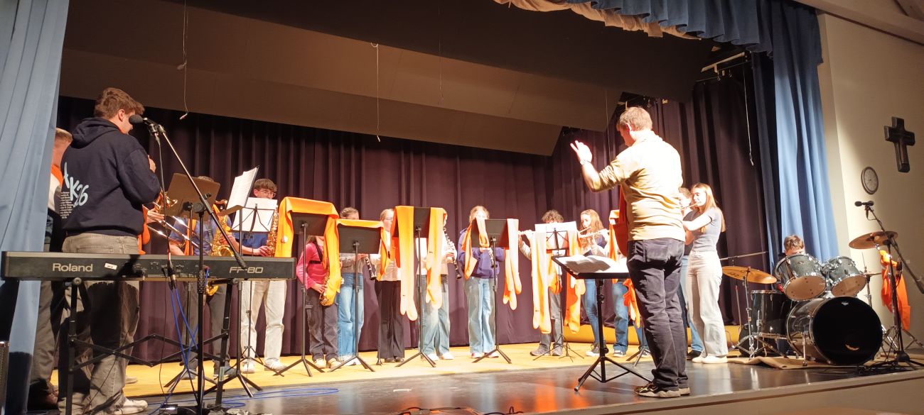 Eine Antwort auf diese Frage gaben zum Ende des ersten Schulhalbjahres an die 250 Mitwirkende aus allen weiterführenden Schularten des BSBZs. Am „Bunten Abend 2026“ spielten, sangen, turnten und musizierten die Kinder und Jugendlichen über zwei Stunden vor einer vollen „Neuen Aula“. Ein Gemisch aus Aufregung und Vorfreude erfüllte den Raum. Schulklassen waren zum Teil in voller Stärke mit Ihren Lehrkräften angetreten um Eltern, Freunden und Gästen endlich das zeigen zu können, was sie in den letzten Wochen eingeübt hatten. Eingeführt vom rosa gekleideten Zeremonienmeister Jörg Seethaler startete das Moderatorenteam aus der Theater-Freizeitgruppe in den Abend. Behütet mit überdimensionalen farbigen Zylindern, Fähnchen in allen Farben schwenkend, war allen ziemlich schnell klar: Der Abend wird bunt, knallbunt. Als Erste hauten die Vaganten mit ihren Trommeln so richtig auf die Pauke und zwar so, dass die Wände vibrierten. Danach ließ die RS5a 99 Luftballons steigen, ein toll gesungener und musikalisch glänzend begleiteter Song, heute aktueller denn je. Die 5er aus der WRS besangen danach Rom, die Stadt auf 7 Hügeln: Romans on the dancefloor.