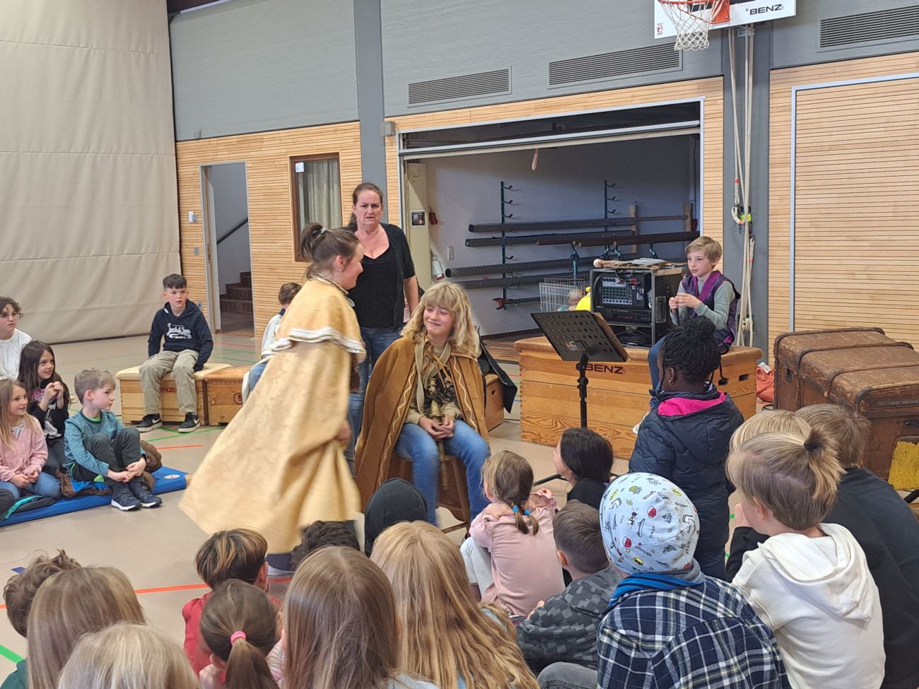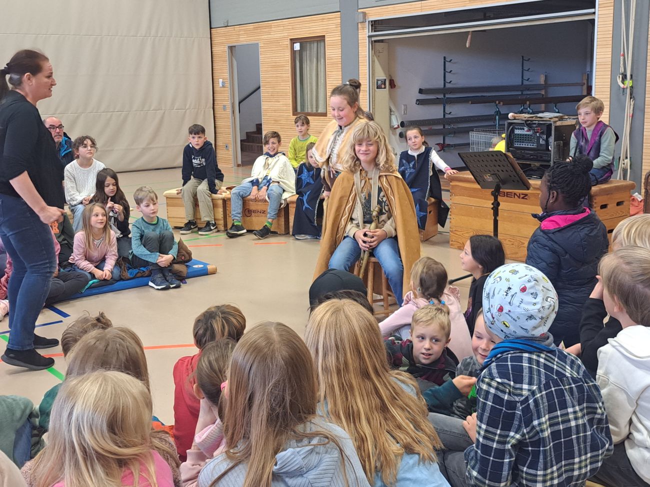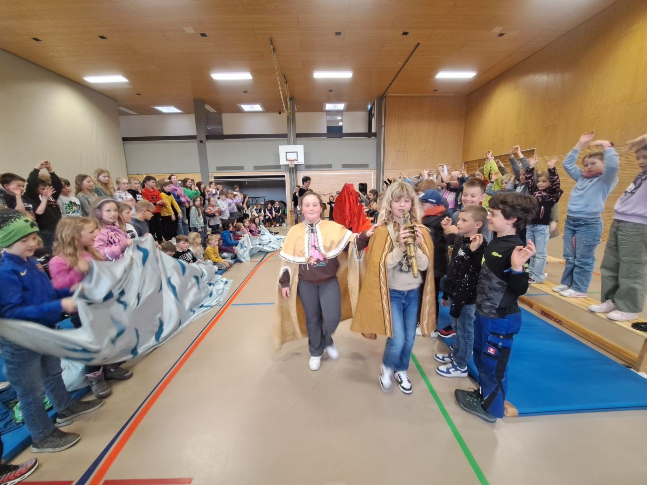 Einmal selbst Schauspieler zu sein und vor ein Publikum zu treten - dieser Traum ging für einige Schüler und Schülerinnen der Grundschule letzten Donnerstag in Erfüllung. Hier fand für alle Schüler*innen unserer Grundschule sowie der Grundschule Rißegg die Kinderoper „Die Zauberflöte“ statt. Neben den beiden professionellen Schauspielern gab es mehrere Rollen, die von Schülern übernommen werden durften. Die 60-minütige Aufführung wurde zwar von den professionellen Schauspielern gestaltet, vorrangig ging es jedoch darum, auch die Zuschauer vielfältig in den Verlauf der Oper zu integrieren, in dem sie mitsingen, sich mitbewegen und einzelne Elemente wie Wind und Wellen mitgestalten durften. Dabei zeigten die Kinder, die eine Rolle gelernt hatten, glänzende Leistungen und konnten das Publikum rundum begeistern. Und das, obwohl die Kinder nur eine ganz kurze Probe vor der Aufführung hatten. Ein ganz dickes Lob an alle Kinder, die sich bereit erklärt hatten, eine Rolle zu übernehmen und auch den Mut, vor so vielen Kindern aufzutreten. Die 60 Minuten gingen wie im Flug vorbei und endeten mit tobendem Applaus.