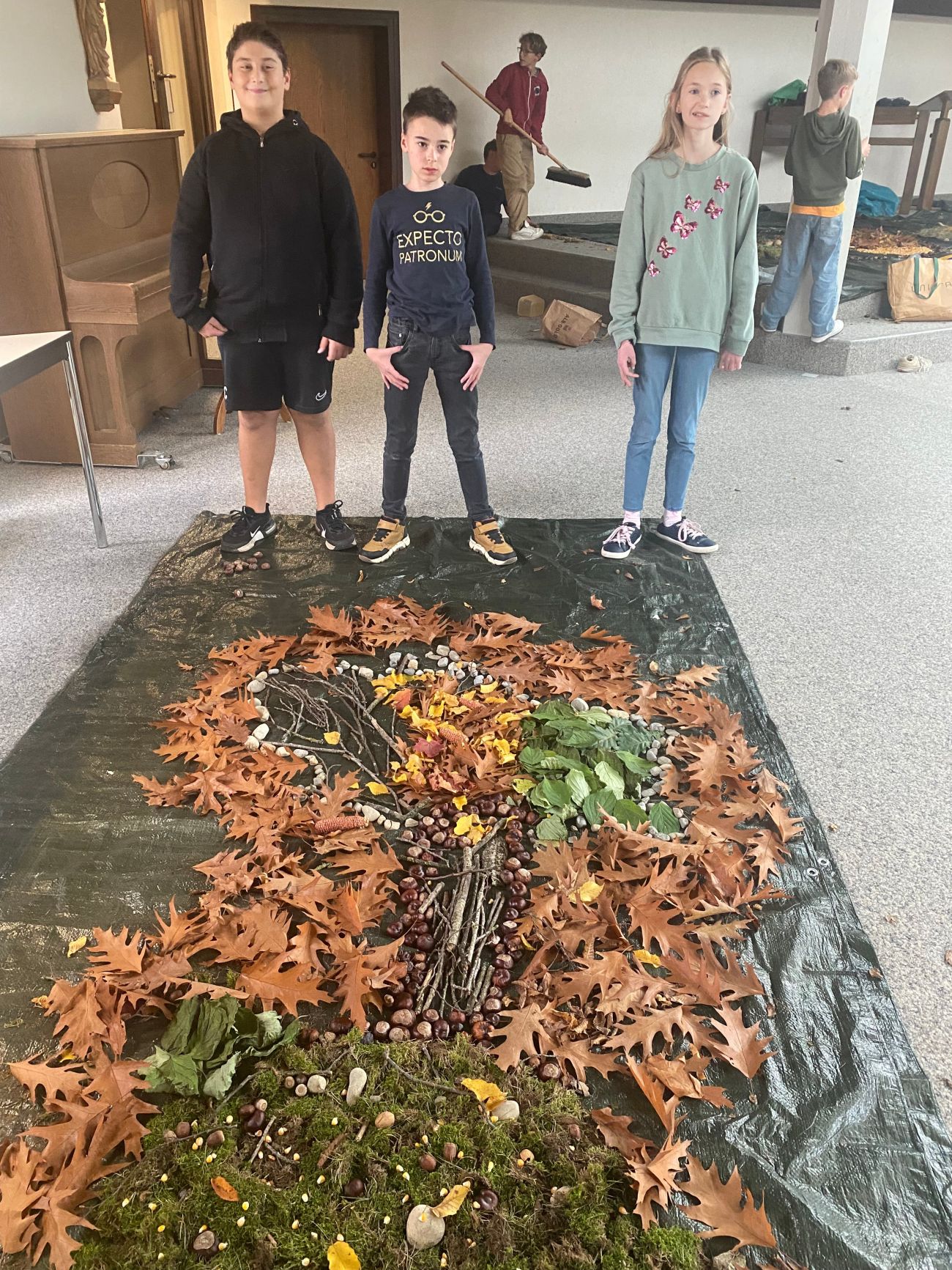 Zwei Tage später wurden mit Wald- bzw. Naturmaterialien Waldmandalas gelegt, die noch ein paar Tage in der alten Aula zu bestaunen sind.