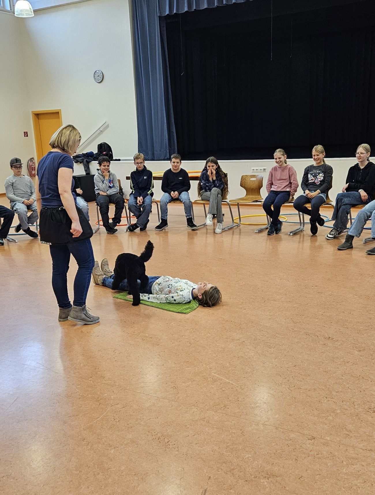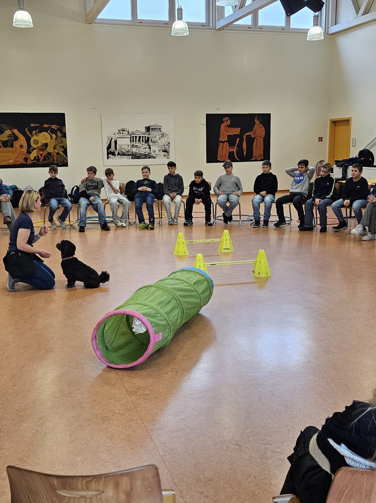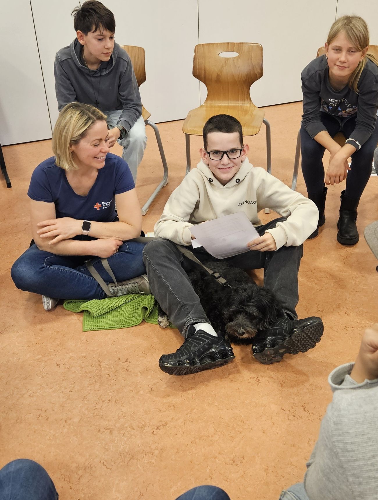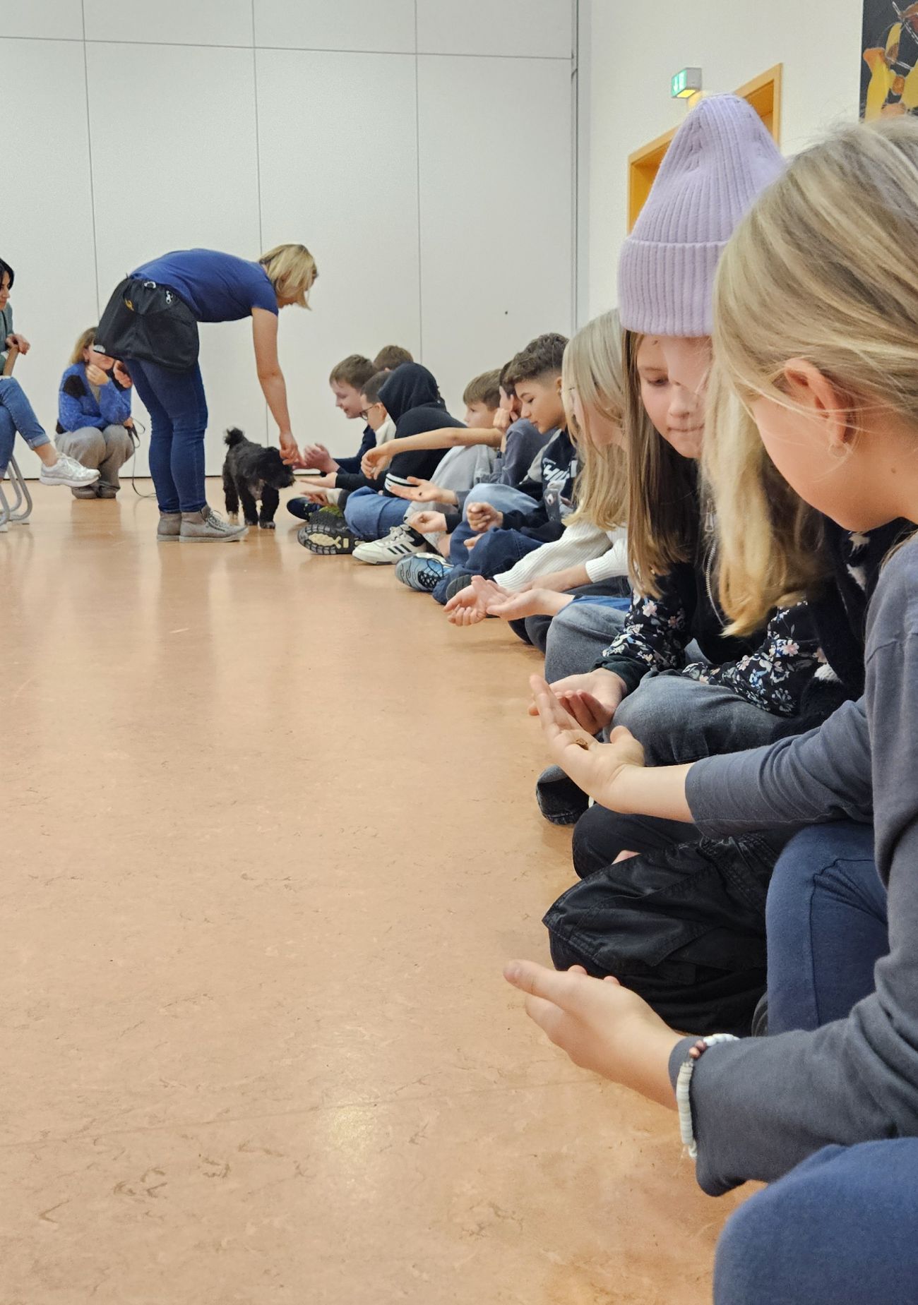 Zu Beginn hatten die Kinder die Gelegenheit, die Hunde kennenzulernen und Vertrauen zu ihnen aufzubauen. Anschließend teilte sich die Klasse in zwei Gruppen auf. Eine Gruppe beschäftigte sich zunächst mit dem Thema Assistenzhunde allgemein: Welche Aufgaben haben sie? Wie werden sie ausgebildet? Und wie arbeitet man korrekt und respektvoll mit ihnen zusammen?
