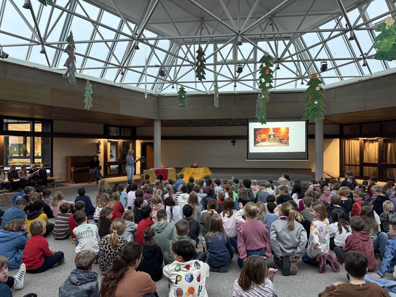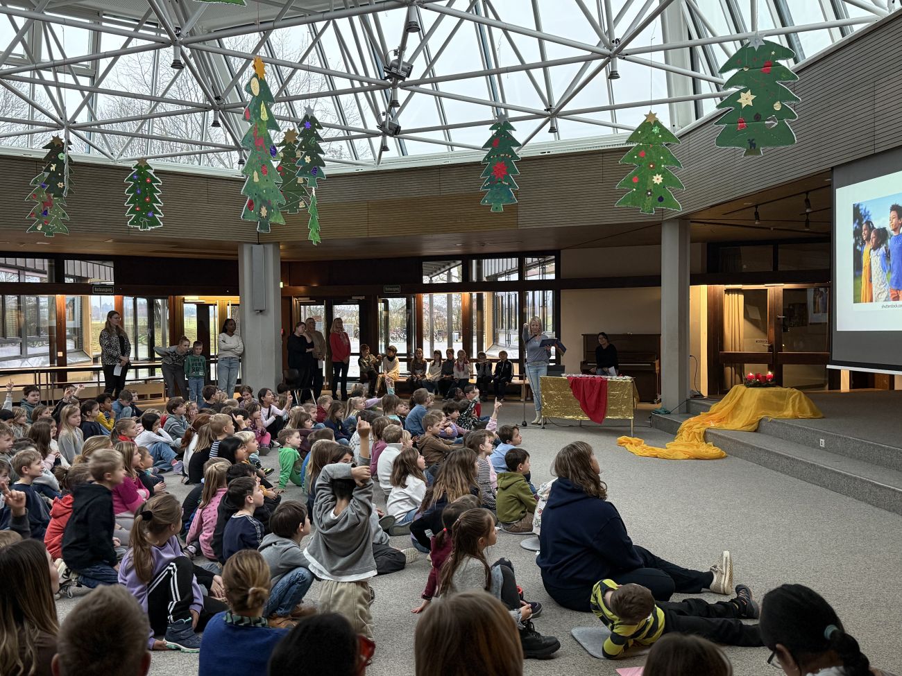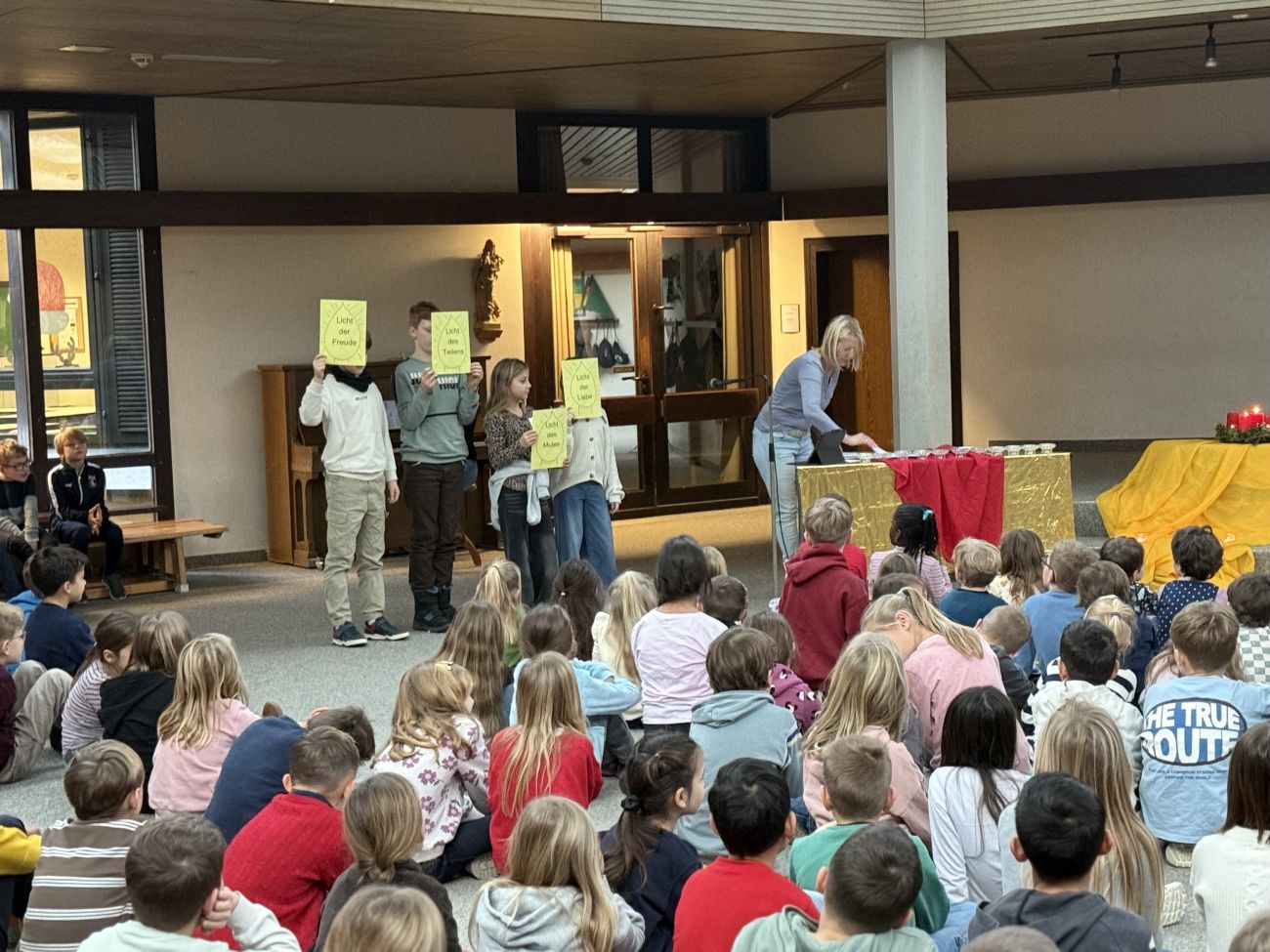 Bei Dämmerlicht und Kerzenschein wurde der gemeinsame Morgenkreis mit dem Lied „Wir sagen euch an den lieben Advent“ in der Alten Aula eröffnet. Mit einer Bilderpräsentation, passenden Liedern und Gebeten konnten die Kinder nachspüren, welche Wünsche Maria, Josef und die Hirten vor 2000 Jahren hatten und wie es mit unseren heutigen Wünschen zu Weihnachten aussieht. Die Kinder konnten feststellen, dass der Wunsch der Menschen nach einer guten Gemeinschaft in den 2000 Jahren gleichgeblieben ist.