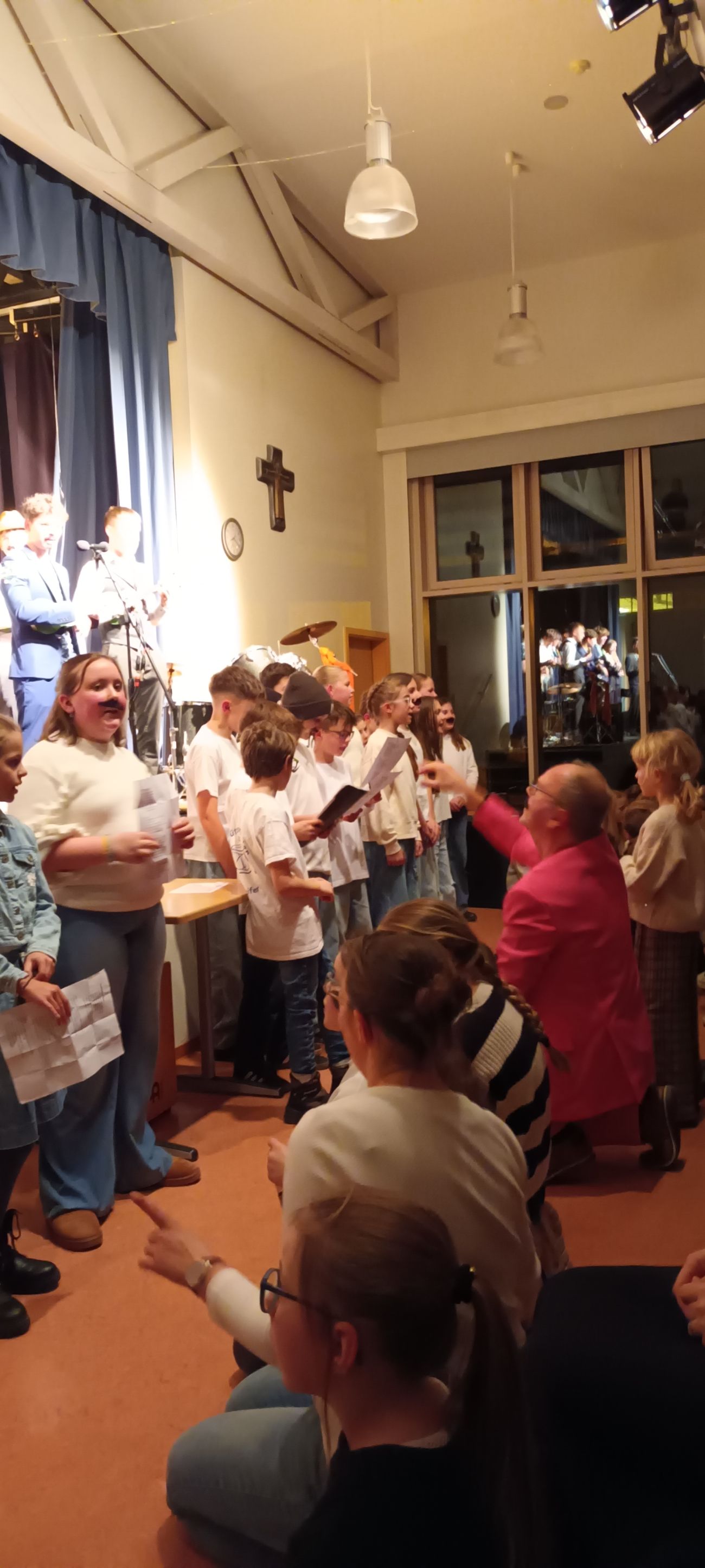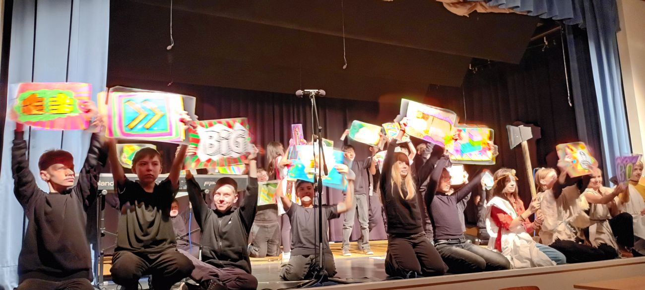 Eine Antwort auf diese Frage gaben zum Ende des ersten Schulhalbjahres an die 250 Mitwirkende aus allen weiterführenden Schularten des BSBZs. Am „Bunten Abend 2026“ spielten, sangen, turnten und musizierten die Kinder und Jugendlichen über zwei Stunden vor einer vollen „Neuen Aula“. Ein Gemisch aus Aufregung und Vorfreude erfüllte den Raum. Schulklassen waren zum Teil in voller Stärke mit Ihren Lehrkräften angetreten um Eltern, Freunden und Gästen endlich das zeigen zu können, was sie in den letzten Wochen eingeübt hatten. Eingeführt vom rosa gekleideten Zeremonienmeister Jörg Seethaler startete das Moderatorenteam aus der Theater-Freizeitgruppe in den Abend. Behütet mit überdimensionalen farbigen Zylindern, Fähnchen in allen Farben schwenkend, war allen ziemlich schnell klar: Der Abend wird bunt, knallbunt. Als Erste hauten die Vaganten mit ihren Trommeln so richtig auf die Pauke und zwar so, dass die Wände vibrierten. Danach ließ die RS5a 99 Luftballons steigen, ein toll gesungener und musikalisch glänzend begleiteter Song, heute aktueller denn je. Die 5er aus der WRS besangen danach Rom, die Stadt auf 7 Hügeln: Romans on the dancefloor.