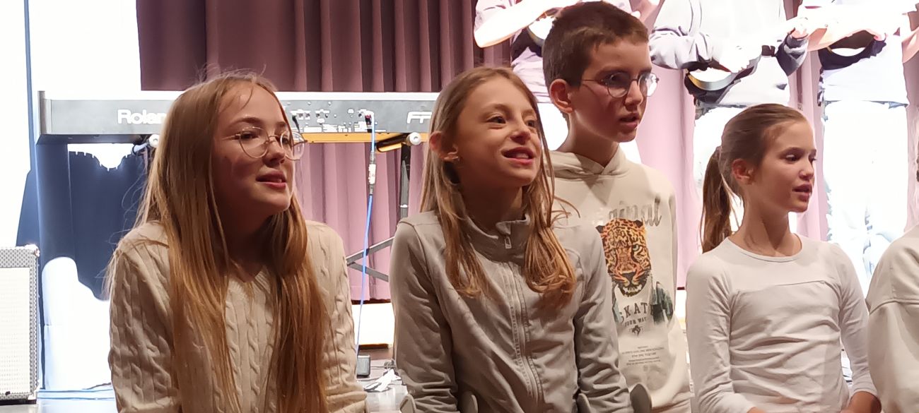 Nach kurzem Umbau entzückten die Mädchen der RS6a durch Tanzakrobatik, bevor ihre Klassenkameraden Tim und Neo das Publikum mit gewagten Reifensprüngen in Atem hielten. Richtig Stimmung im Saal herrschte beim Barbie Song und dem Lied „Wo ist meine Mama, wer hat sie gesehen“. Beide Musikstücke gestalteten die 6. Klassen der WRS mit ihren Boomwhackers gekonnt und mit hoher Konzentration. Mit verblüffenden Effekten verzauberten im Anschluss die 6. Klassen des Gymnasiums das Publikum. Inspiration für ihr Schattentheater „Der Nussknacker“ hatten sich die Schüler in den vorangegangenen Wochen im Ballett in Stuttgart geholt. Gleich danach behauptete ein Chor der RS6b in einem bekannten Song, dass die Löwen heute Nacht schlafen würden. Mucksmäuschenstill war es im Saal, als Leonie und Rebecca ihren Auftritt hatten. Begleitet von einer Gitarre bat die Sängerin in ihrem Lied alle, auf ihr Bauchgefühl zu achten. Dass Teile des Programms im Advent entstanden, zeigte das groovige Jingle Bells der RS5a, begleitet von einigen Achtklässlern. Musikalisch mit hoher Geschwindigkeit gings auch gleich weiter und zwar mit dem Bischi Abbrunzati Boys und Girls-Hit: Velocita. Die gymnasiale Oberstufe, alle an diesem Abend beim Theaterbesuch in der Stadthalle Biberach, schickte per Video ihren Song Barbar‘ Ann, einen Beach Boys Klassiker, in den Saal. Um Zusammenhalt ging es im Lied „Stand by me“, den die RS7b ausdrucksstark in einer stimmigen Choreographie umsetzte. Herzerwärmend und am Flügel begleitet intonierte die 7b des Gymnasiums den Titelsong „Vois sur ton chemin“ aus dem französischen Film „Die Kinder des Monsieur Mathieu“.